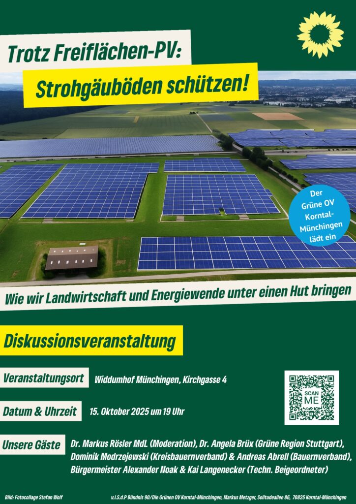 „Trotz Freiflächen-PV: Strohgäuböden schützen! Wir laden ein zur öffentlichen Diskussion. Wir wir Landwirtschaft und Energiewende unter einen Hut bringen. Mittwoch15.10.202519:00 ‐ 21:00 UhrWiddumhof MünchingenKirchgasse 470825 Korntal-Münchingenorganisiert von Grüner Ortsverband Korntal-MünchingenDownload als ics-Datei